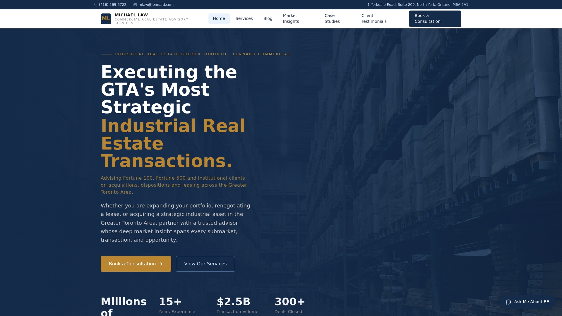 | Michael Law Real Estate | Industrial property brokerage and advisory in GTA | 15+ years experience; $2.5B deal volume; local market data; Fortune 100 recognition | Pricing not disclosed; location-specific service | Contact for pricing |