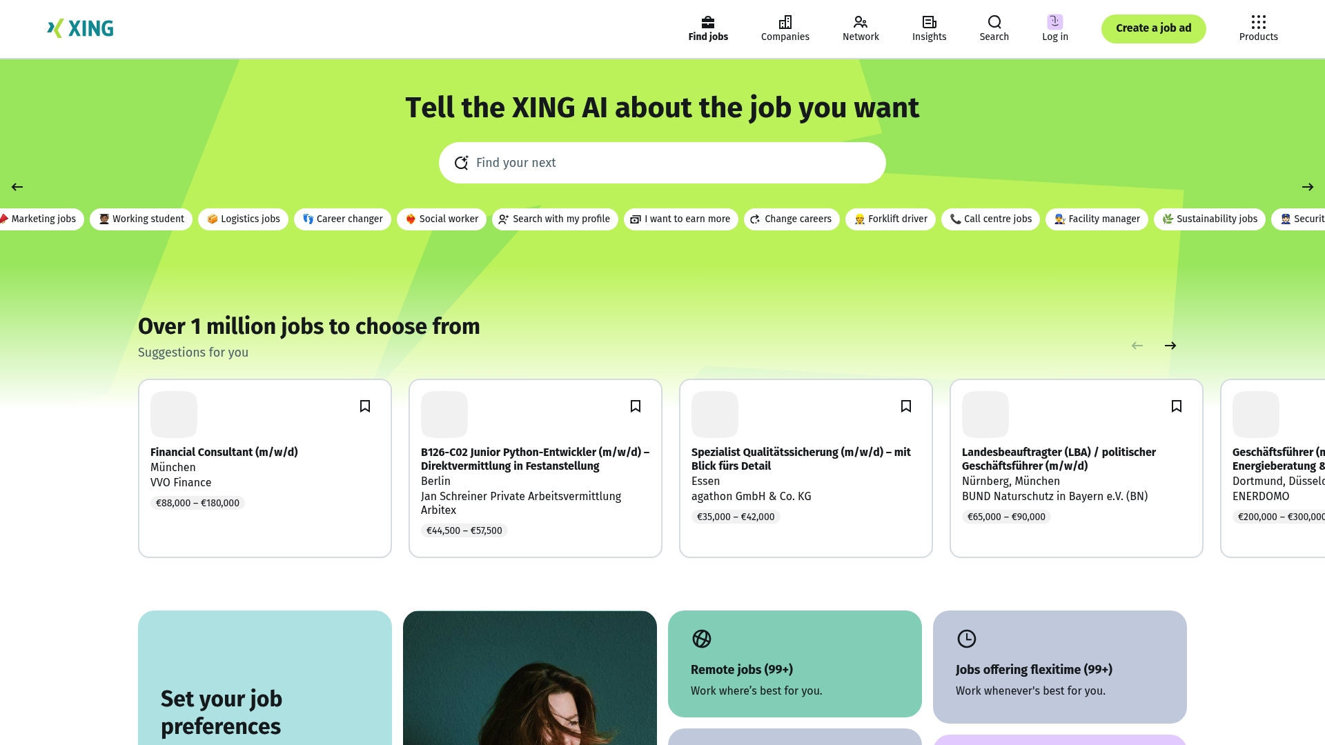 XING offers job search by category and location, networking with professionals, creating and publishing job ads, CV creation tools, and a library of career advice articles. These tools combine a searchable job database with employer facing recruiting functions and candidate facing profile optimisation.